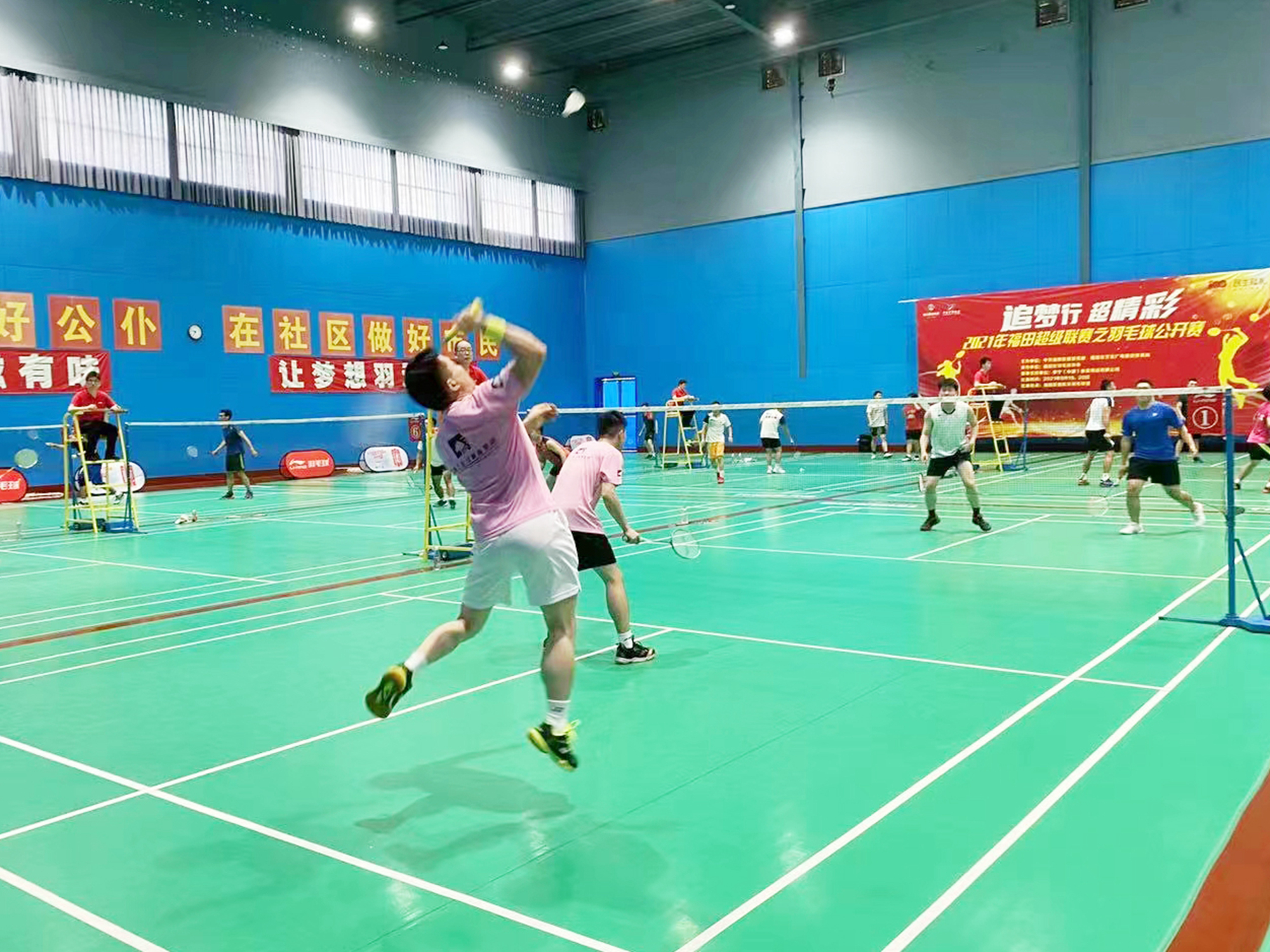 9月19日上午,2021福田超級聯賽之羽毛球公開賽在福田區委羽毛球館開打。本次比賽由中共福田區委宣傳部、福田區文化廣電旅游體育局主辦,福田區羽毛球協會承辦。比賽執行中國羽毛球協會審定的最新2020版羽毛球競賽規則。但在合法發球的判罰上不使用固定高度發球規則。本次比賽吸引深圳市48支隊伍共432名運動員報名參加,參賽隊伍來自全區多個企事業單位、俱樂部、社區、社團等。