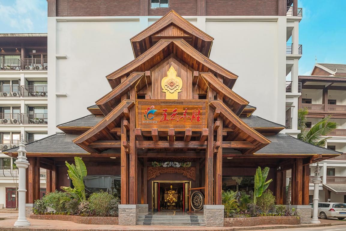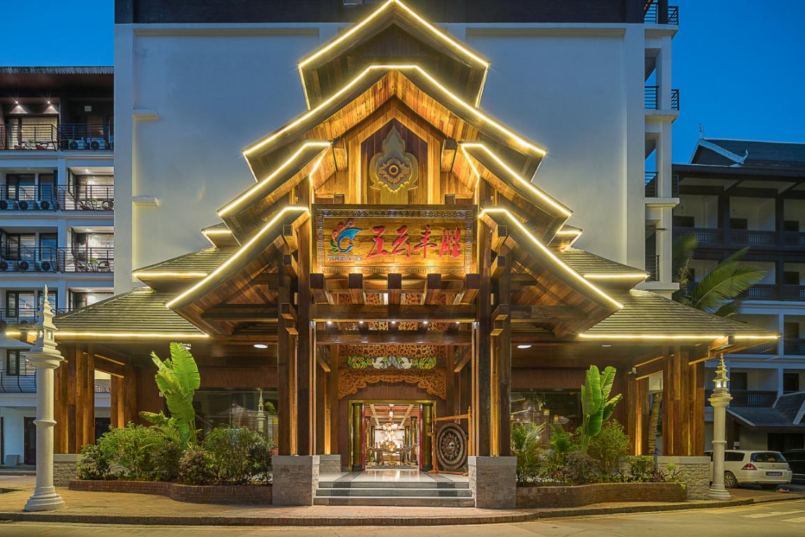在酒店的門頭設(shè)計上,沿用佛教國家泰國的“多層屋頂”的結(jié)構(gòu)設(shè)計,給人向外伸展、莊重大氣的美感。