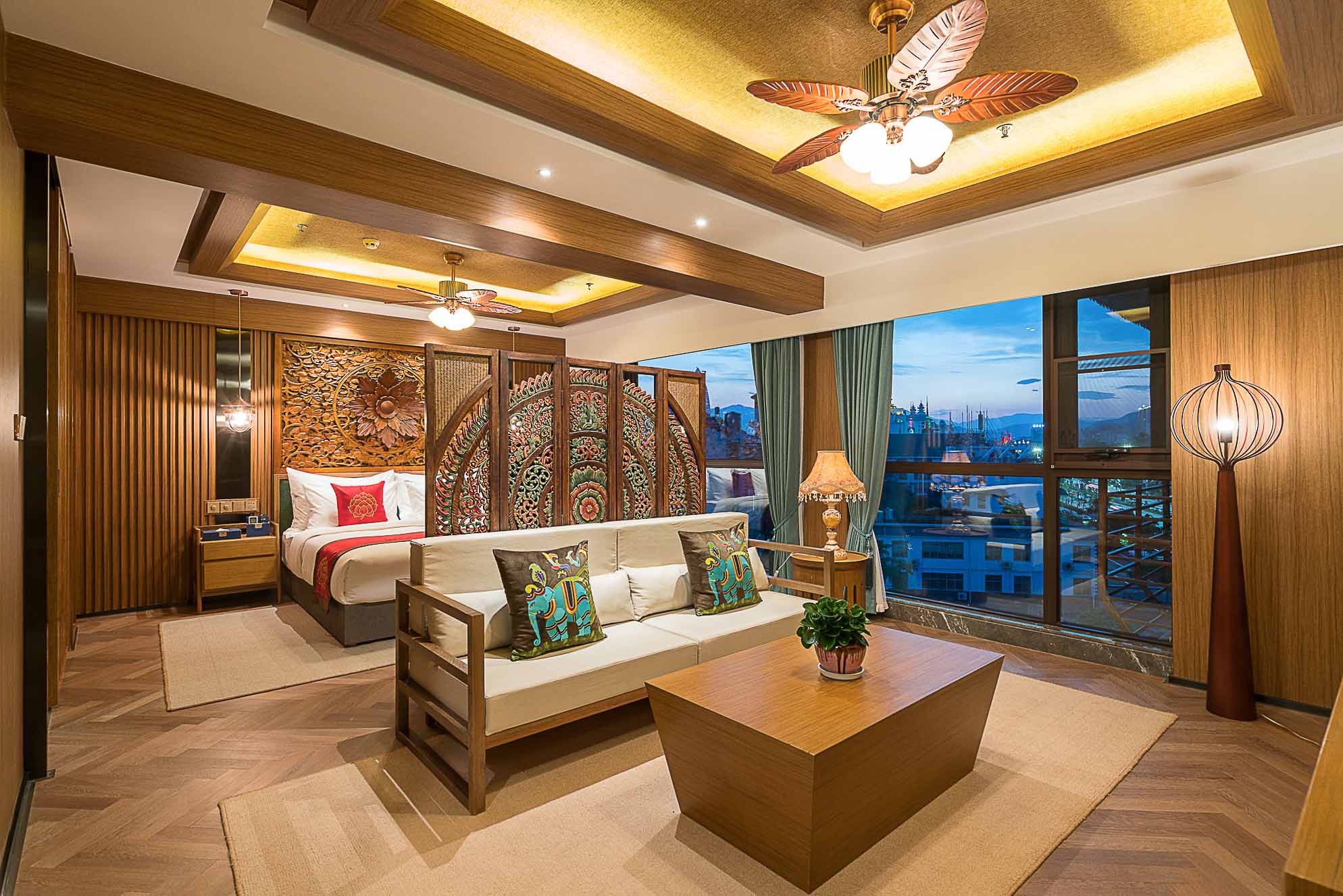 在客房的設(shè)計上,地板、沙發(fā)、茶幾、屏風(fēng)、吊燈、臺燈、背景墻等都采用木材作為原材料,地毯則選用淺色系,給人回歸自然的寧靜感。
