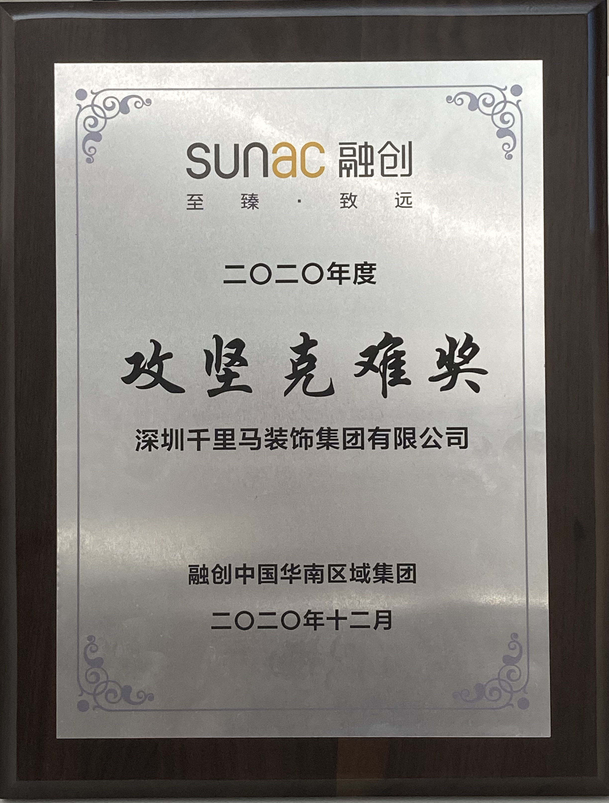近日,深圳千里馬裝飾集團再獲融創(chuàng)中國華南區(qū)域集團頒發(fā)的“2020年度優(yōu)秀供應商”稱號,這是我司自2018年以來連續(xù)第三年獲得此項殊榮,此外,我司今年還同時獲得了集團頒發(fā)的“2020年度攻堅克難”獎。